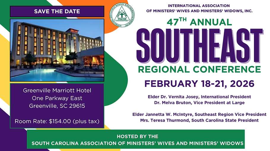 Hosted by Elder Jannetta W. McIntyre, Southeast Region Vice President, Mrs. Teresa Thurmond, South Carolina State President, and the South Carolina Association of Ministers’ Wives and Ministers’ Widows.